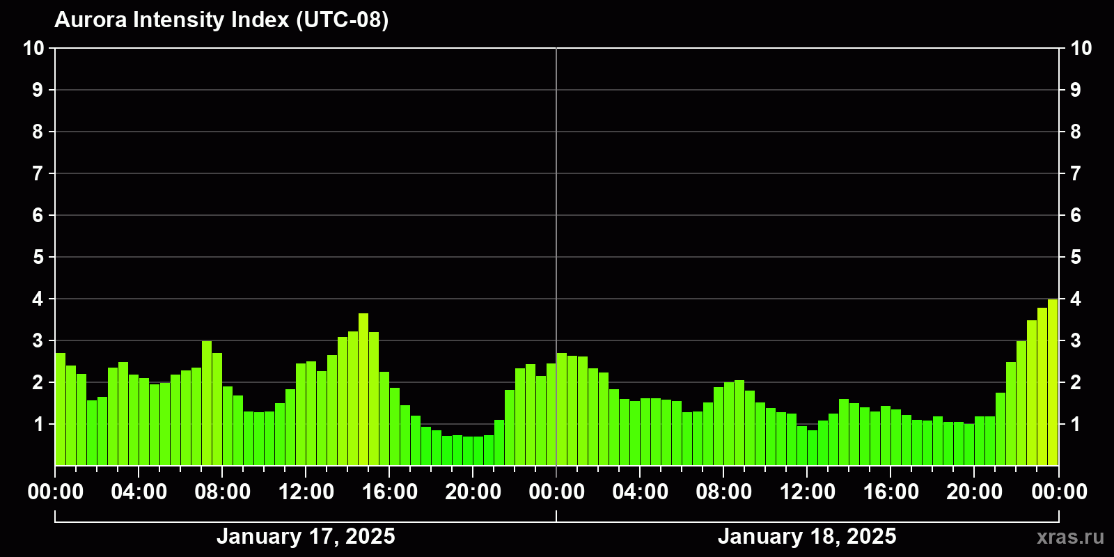 Auroral intensity index and the theoretically possible latitude of observations for nighttime in the Western Hemisphere as of 2025-01-18 23:57 (end of day) local time