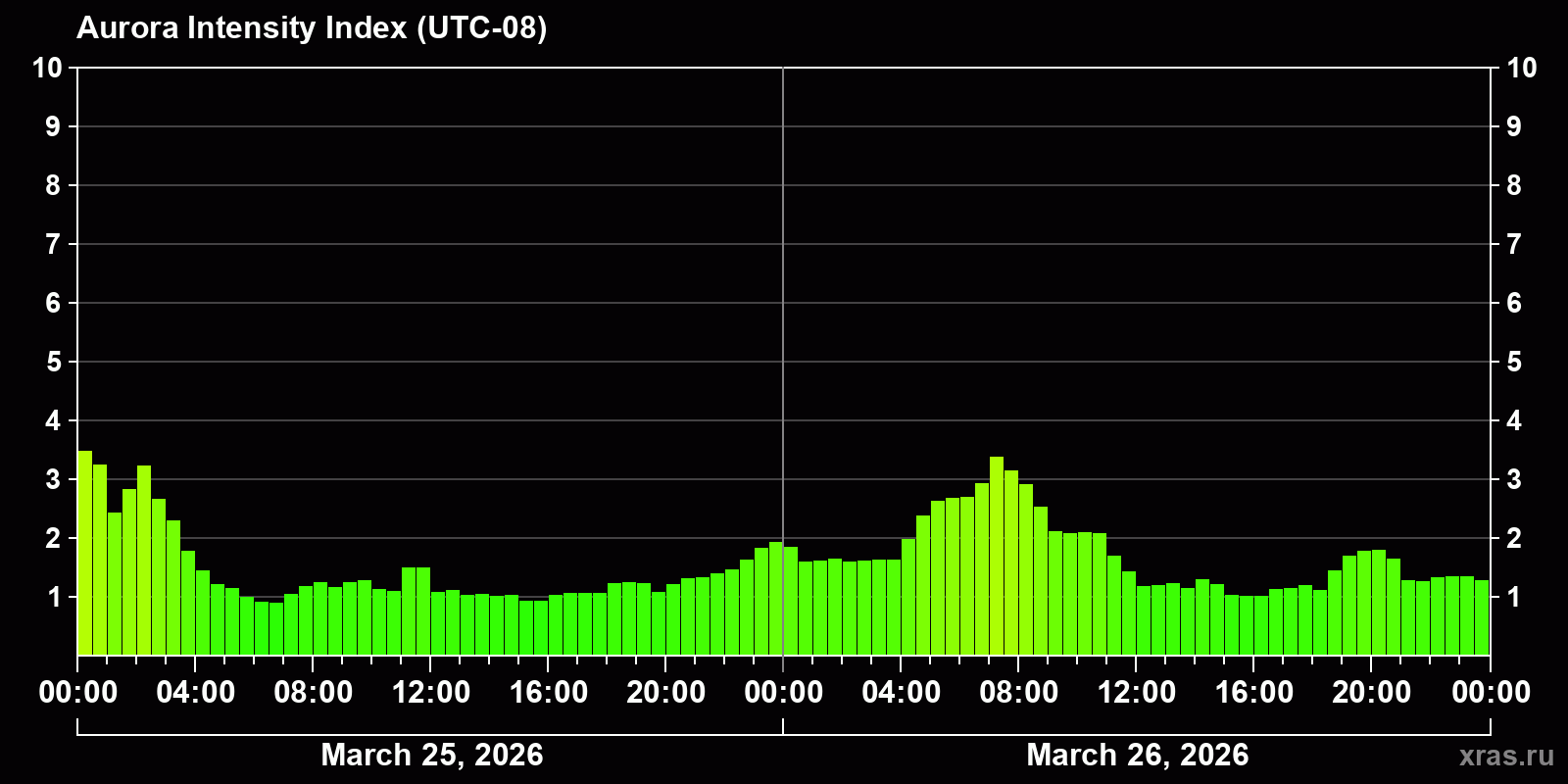 Changes in the auroral intensity index from 2026-03-25 to 2026-03-26 local time