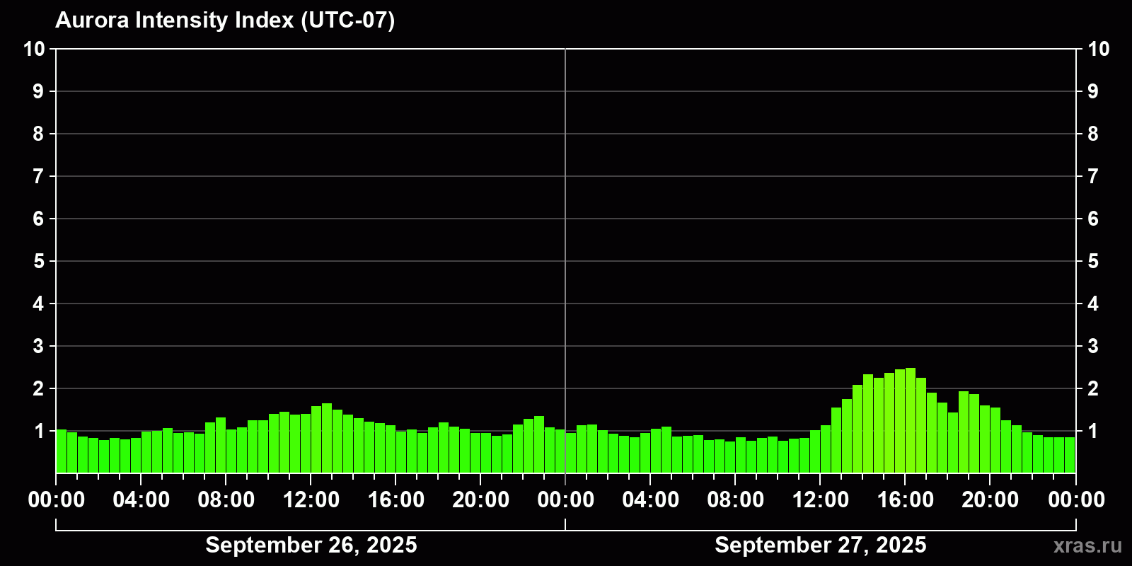 Changes in the auroral intensity index from 2025-09-26 to 2025-09-27 local time