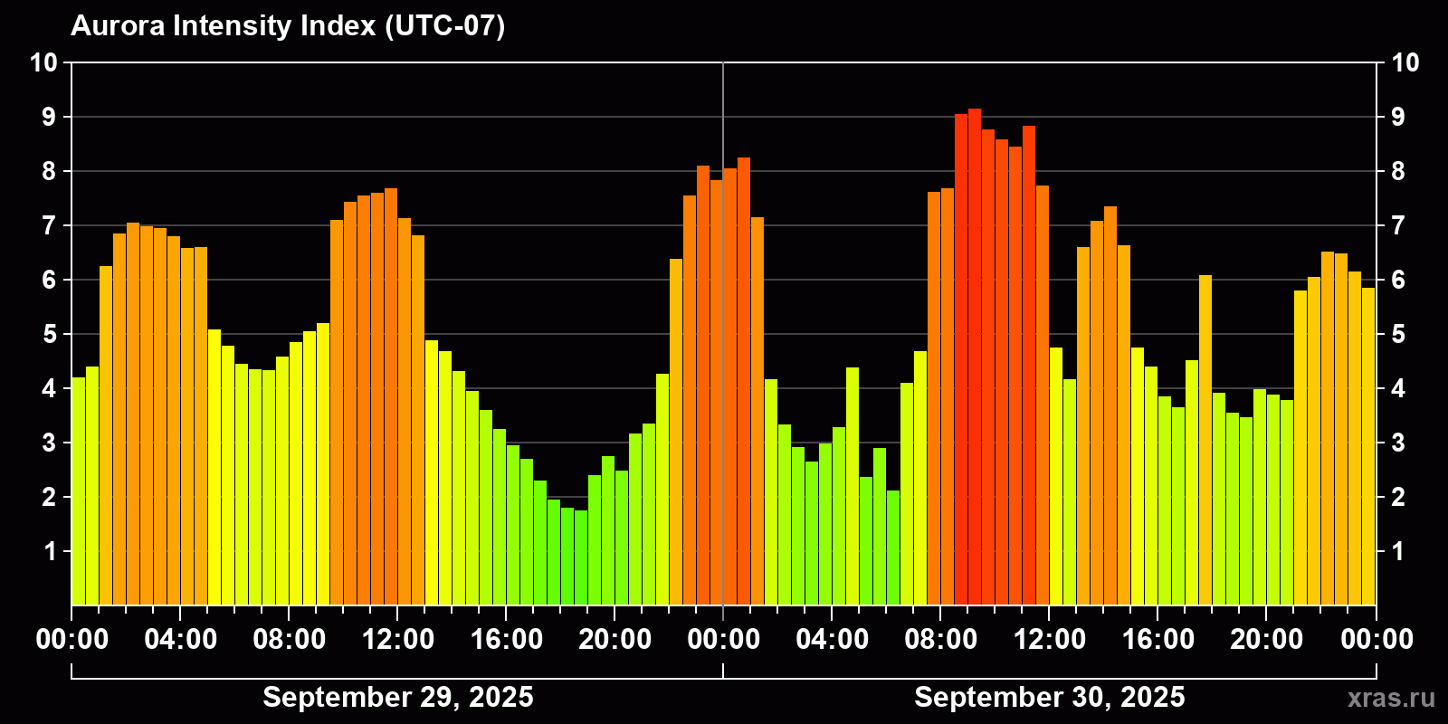 Auroral intensity index and the theoretically possible latitude of observations for nighttime in the Western Hemisphere as of 2025-09-30 23:47 (end of day) local time