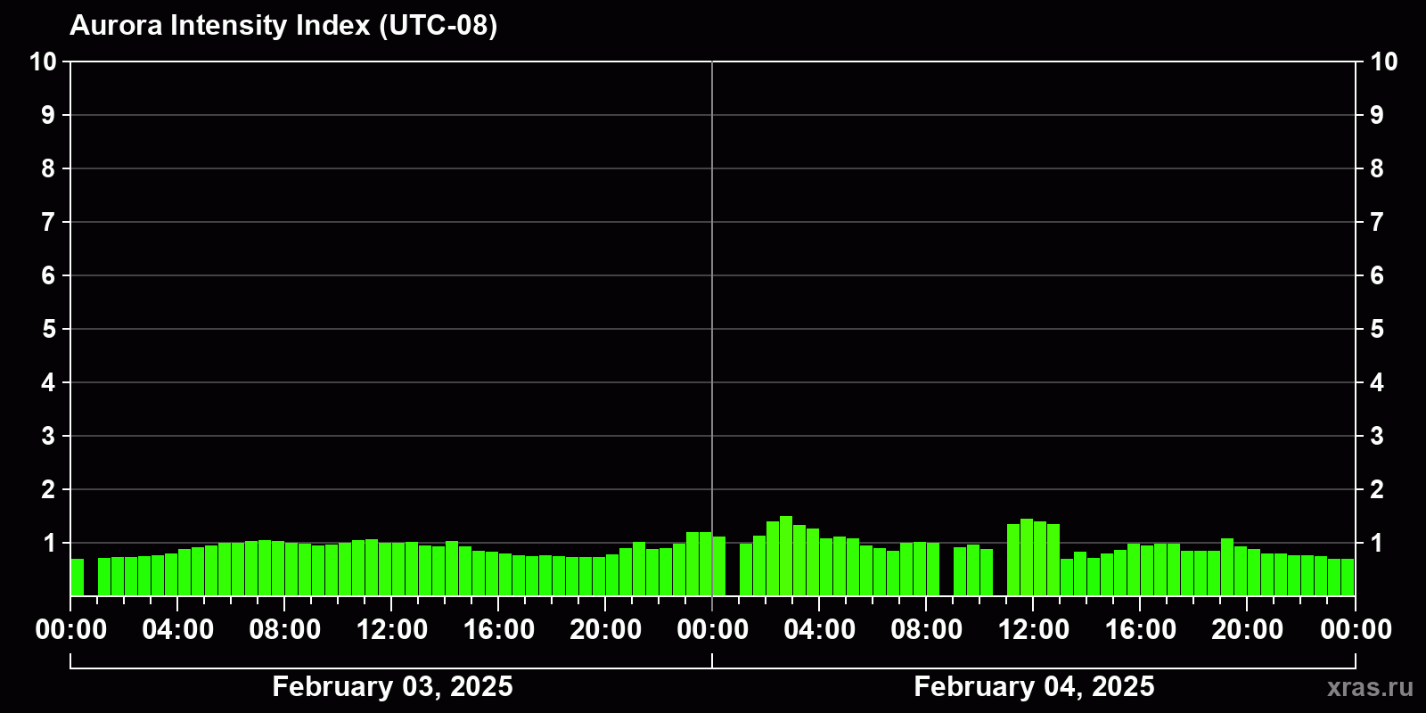 Changes in the auroral intensity index from 2025-02-03 to 2025-02-04 local time