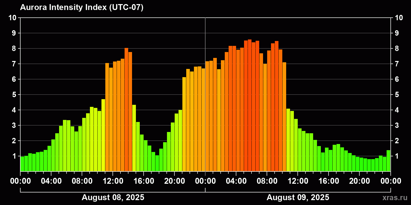 Changes in the auroral intensity index from 2025-08-08 to 2025-08-09 local time