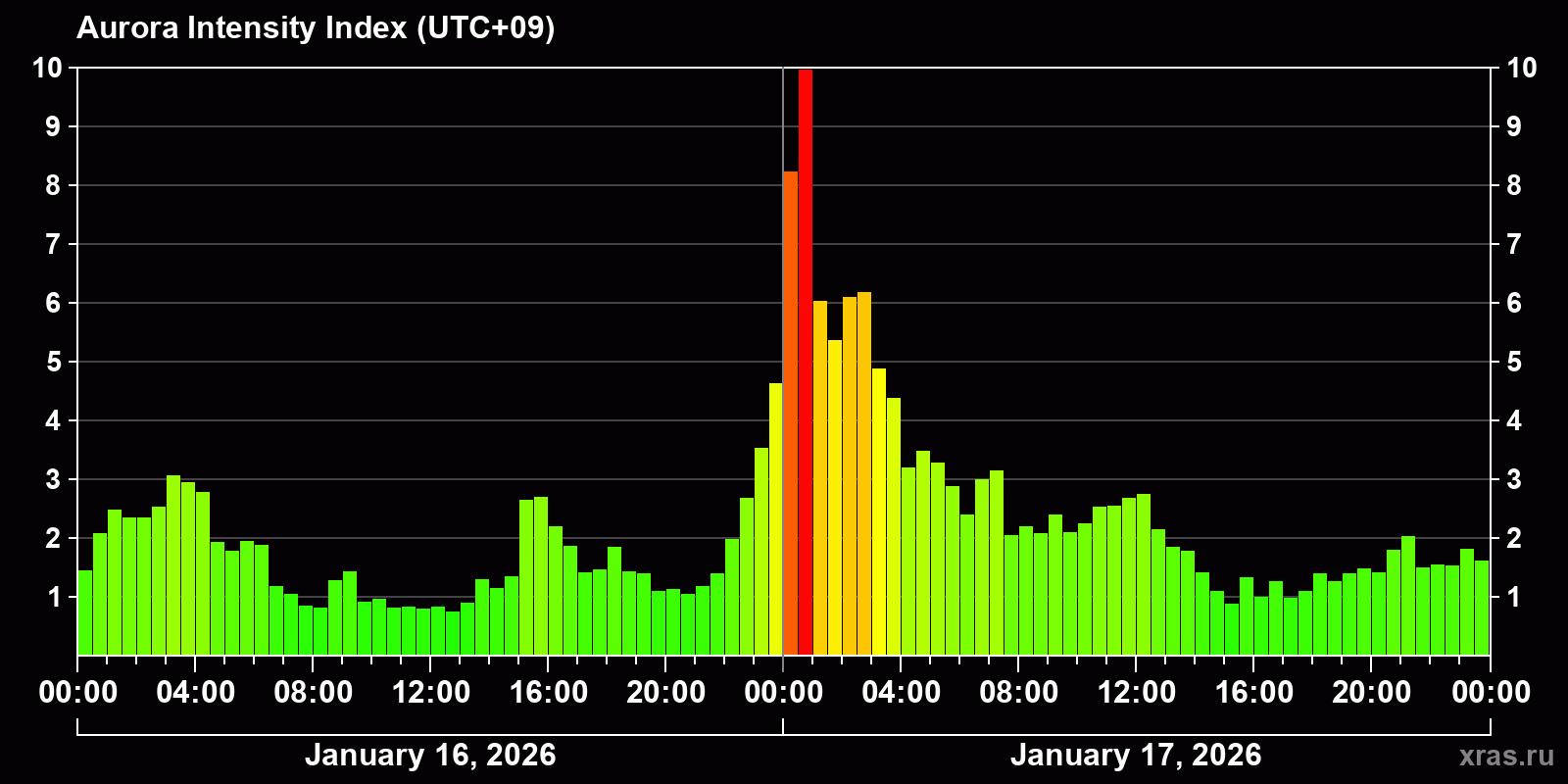 Changes in the auroral intensity index from 2026-01-16 to 2026-01-17 local time
