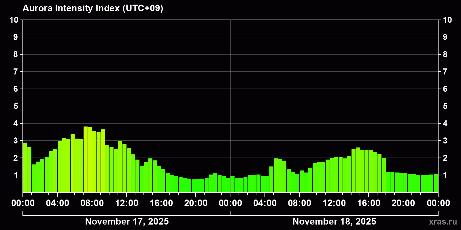 Changes in the auroral intensity index from 2025-11-17 to 2025-11-18 local time
