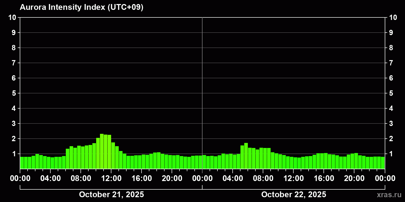 Changes in the auroral intensity index from 2025-10-21 to 2025-10-22 local time