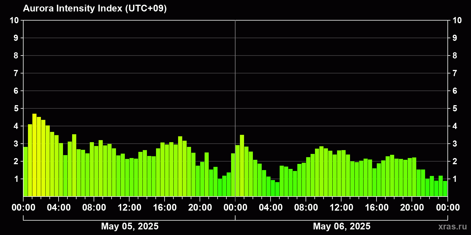 Auroral intensity index and the theoretically possible latitude of observations for nighttime in the Estern Hemisphere as of 2025-05-06 23:55 (end of day) local time
