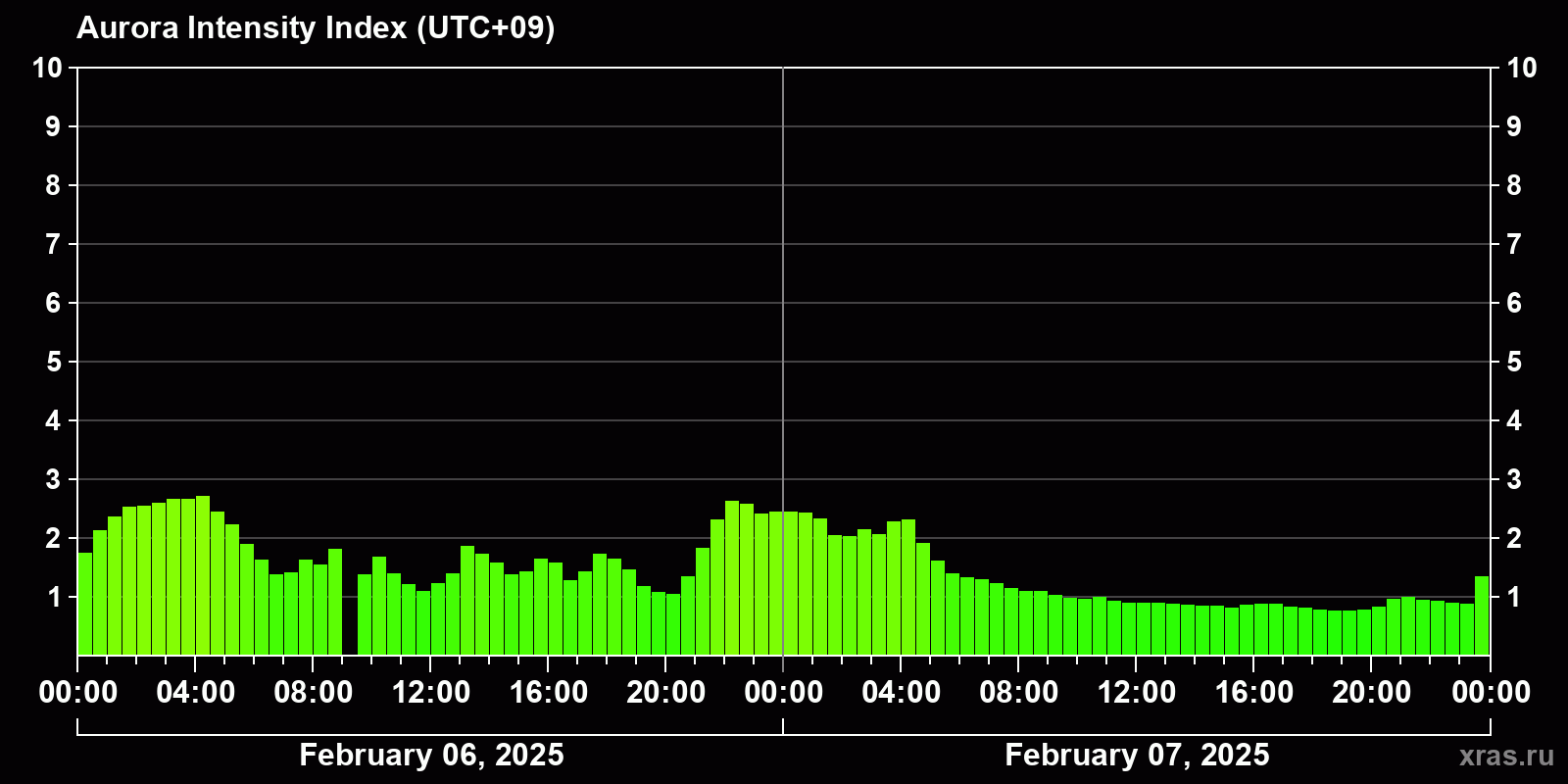Auroral intensity index and the theoretically possible latitude of observations for nighttime in the Estern Hemisphere as of 2025-02-07 23:51 (end of day) local time