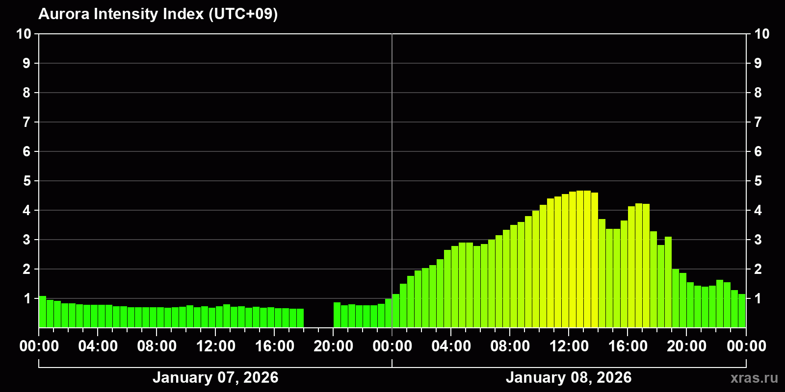 Changes in the auroral intensity index from 2026-01-07 to 2026-01-08 local time