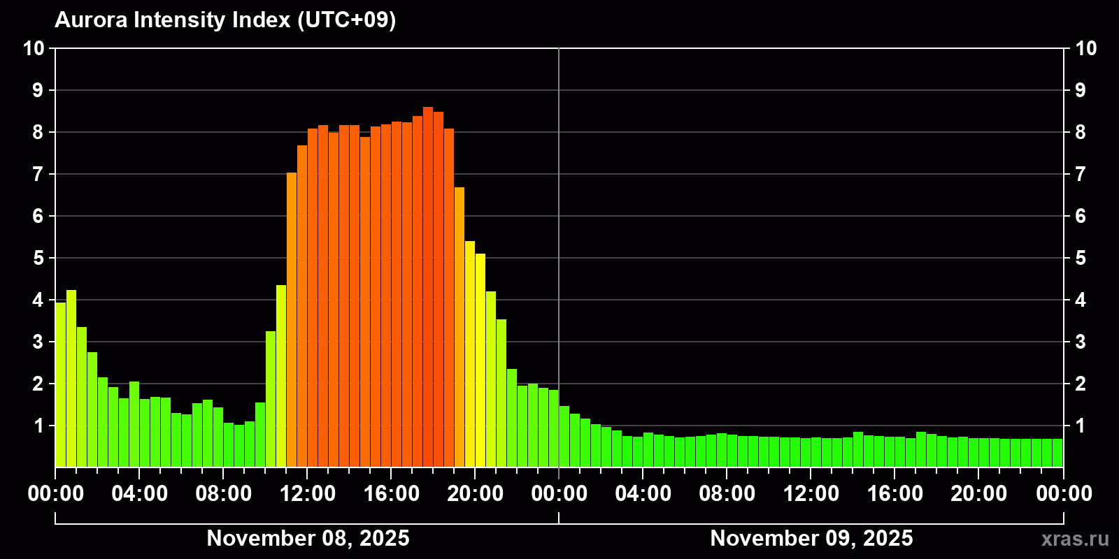 Changes in the auroral intensity index from 2025-11-08 to 2025-11-09 local time