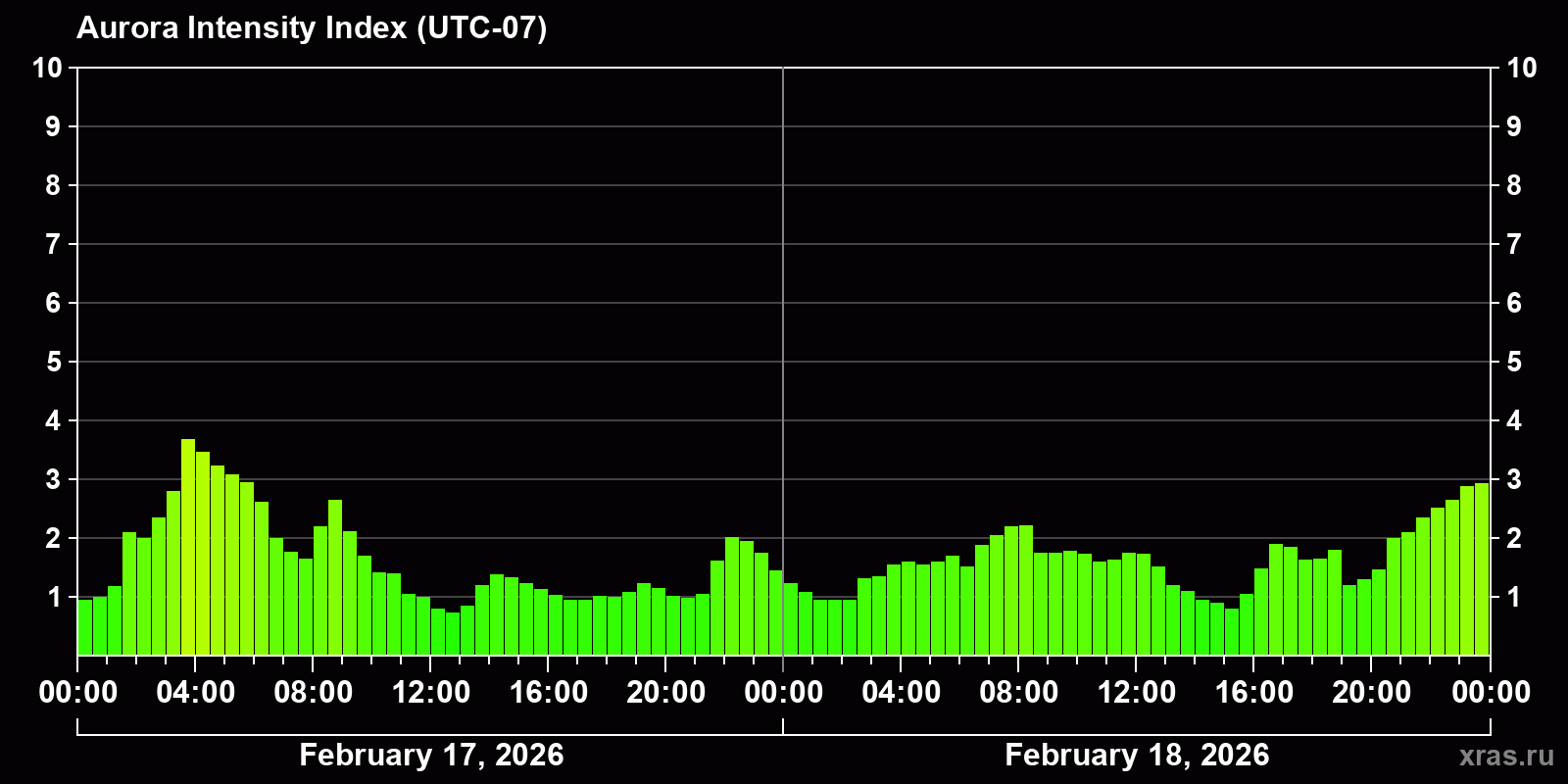 Auroral intensity index and the theoretically possible latitude of observations for nighttime in the Western Hemisphere as of 2026-02-18 23:52 (end of day) local time