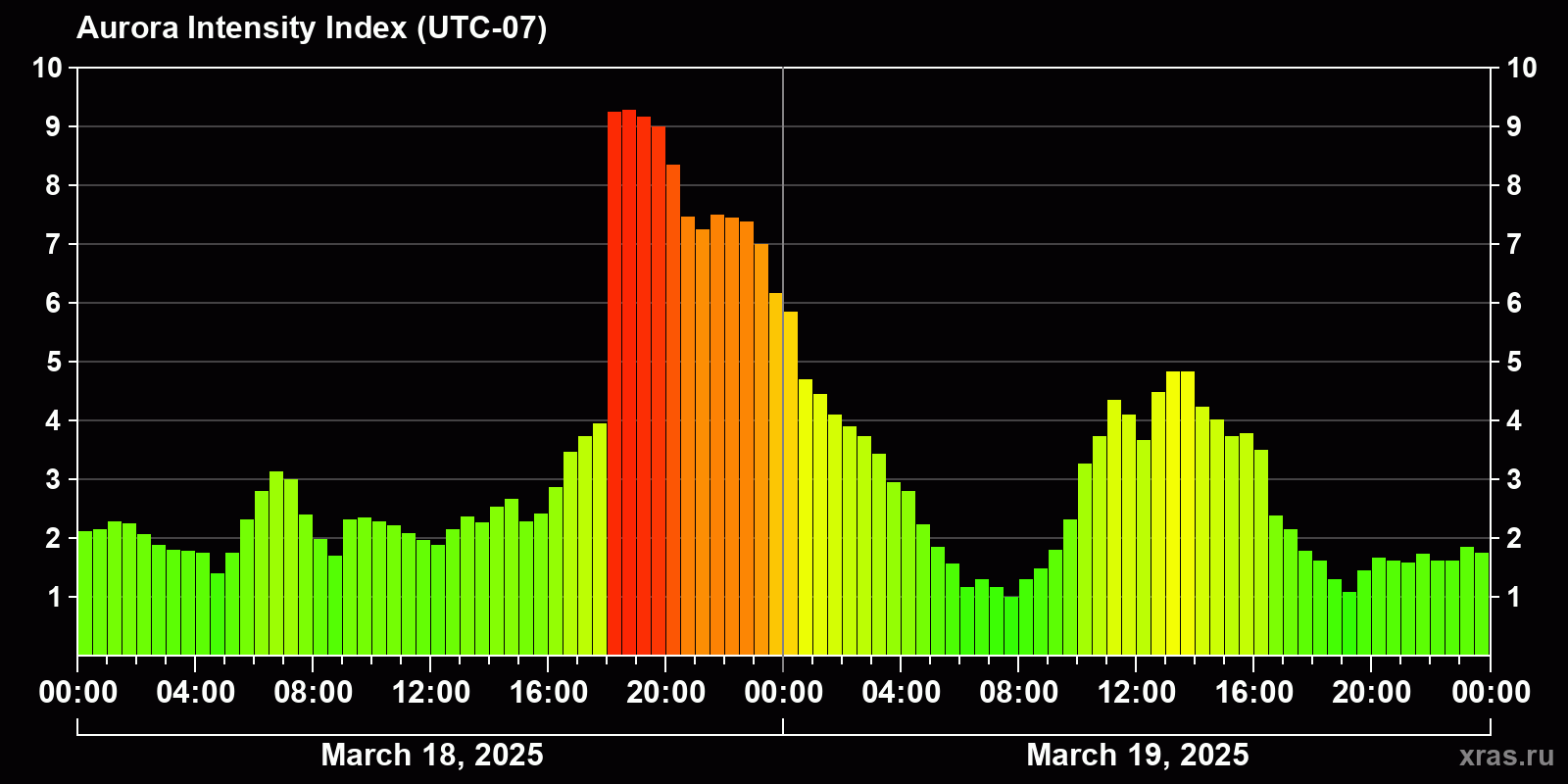 Auroral intensity index and the theoretically possible latitude of observations for nighttime in the Western Hemisphere as of 2025-03-19 23:50 (end of day) local time