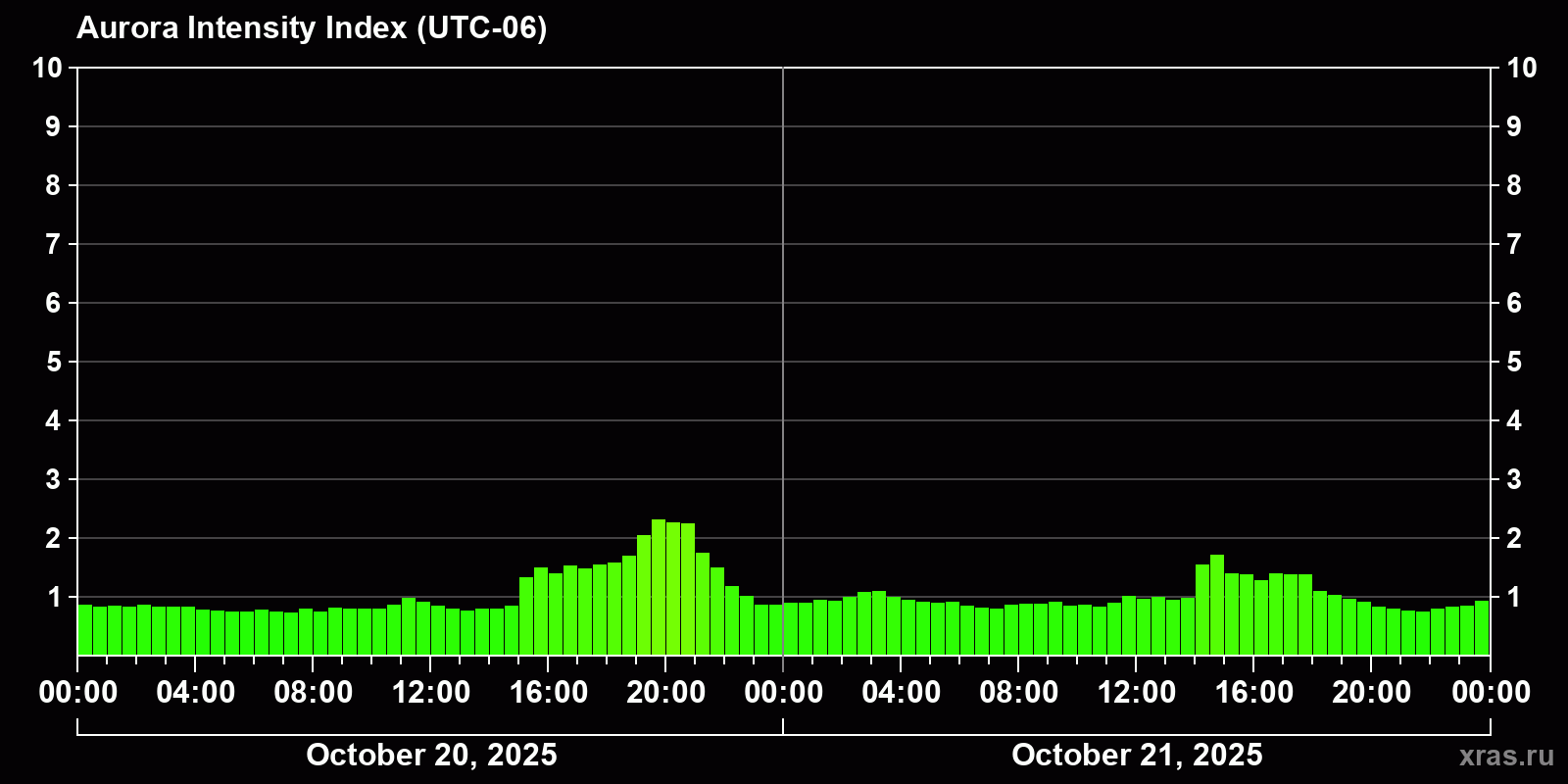 Auroral intensity index and the theoretically possible latitude of observations for nighttime in the Western Hemisphere as of 2025-10-21 23:50 (end of day) local time