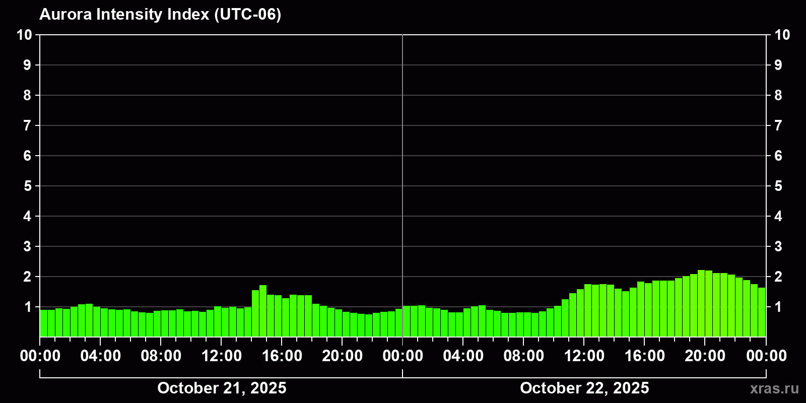 Changes in the auroral intensity index from 2025-10-21 to 2025-10-22 local time