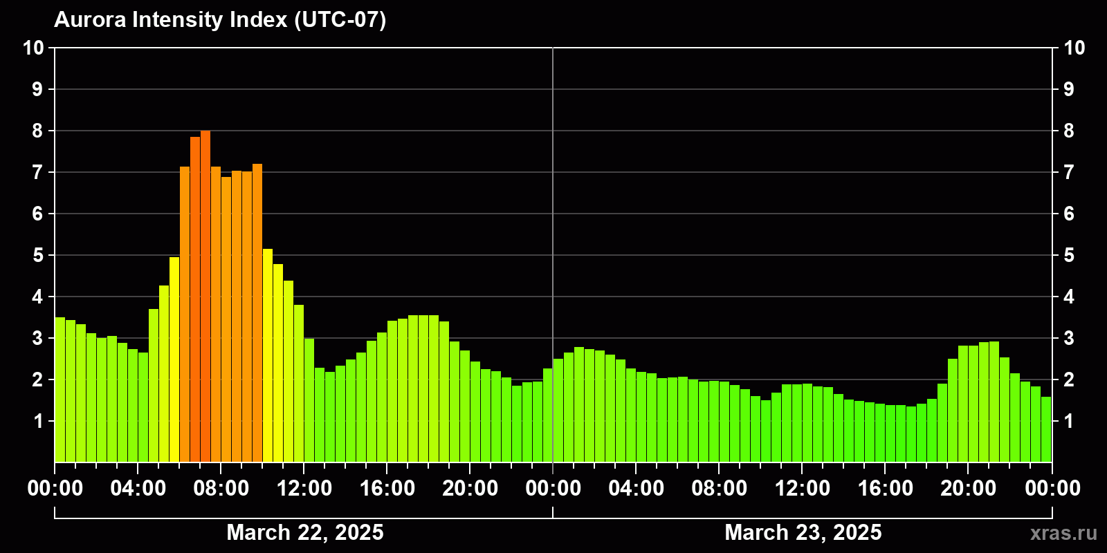 Auroral intensity index and the theoretically possible latitude of observations for nighttime in the Western Hemisphere as of 2025-03-23 23:50 (end of day) local time