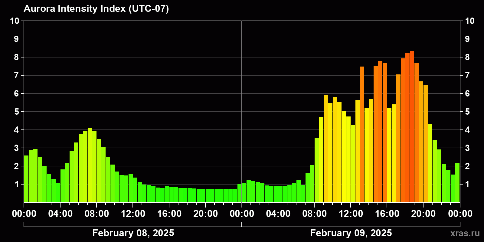 Changes in the auroral intensity index from 2025-02-08 to 2025-02-09 local time
