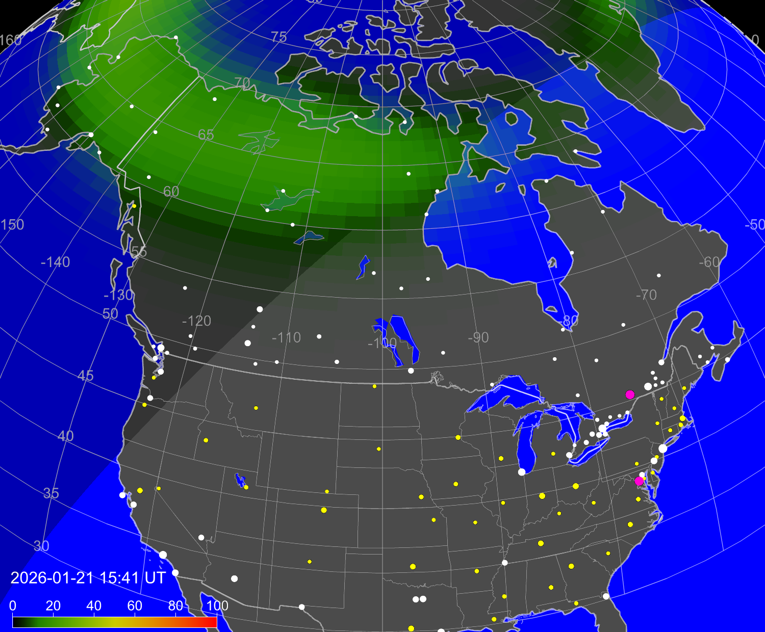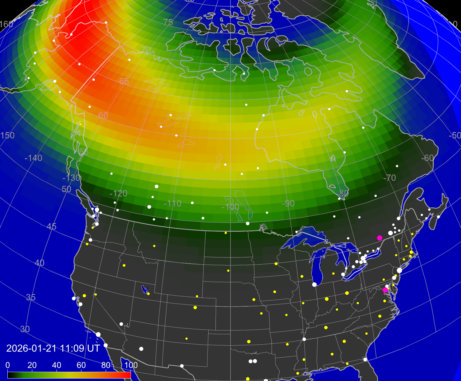 Вероятность полярных сияний в городах США