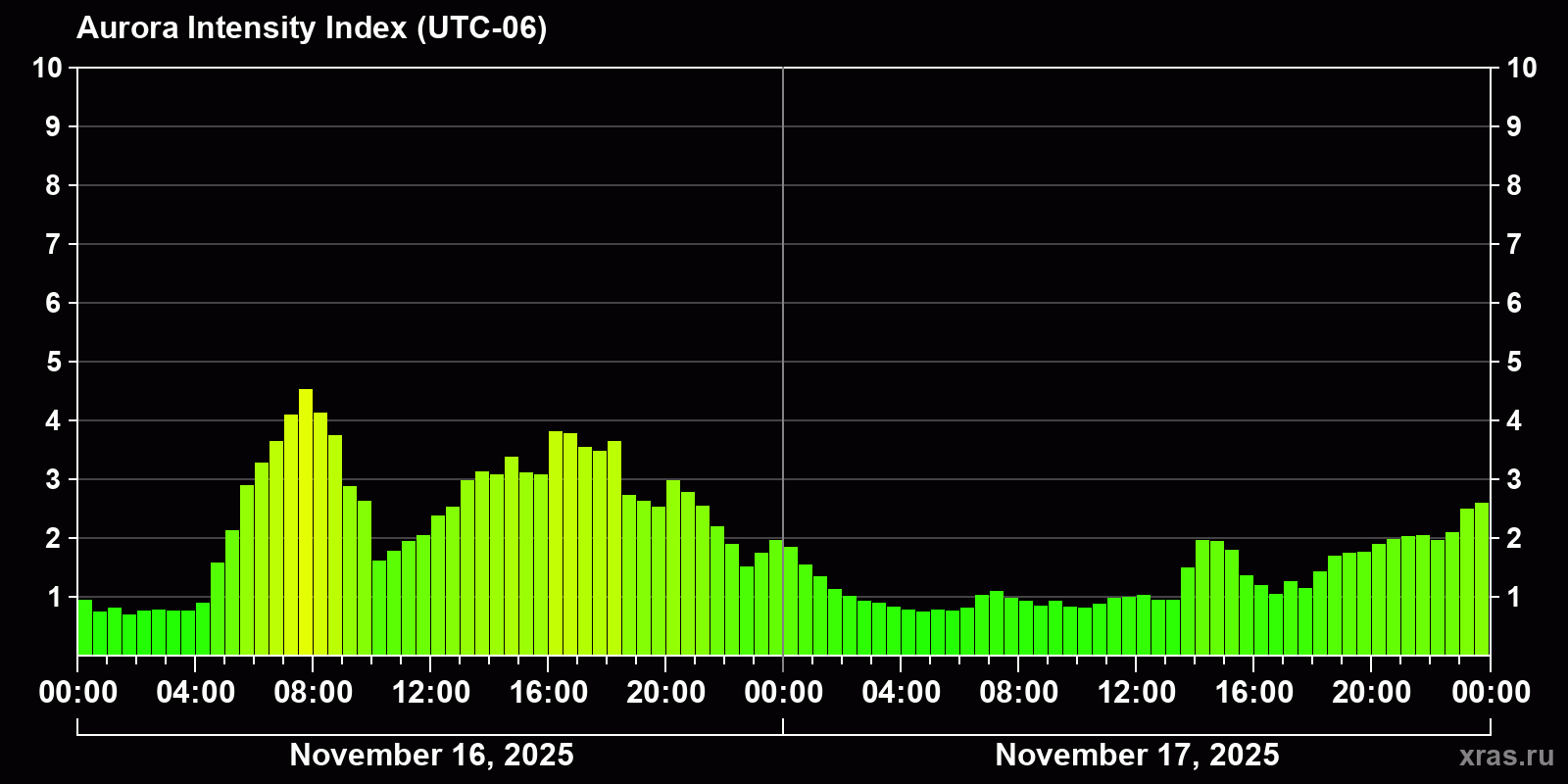 Changes in the auroral intensity index from 2025-11-16 to 2025-11-17 local time