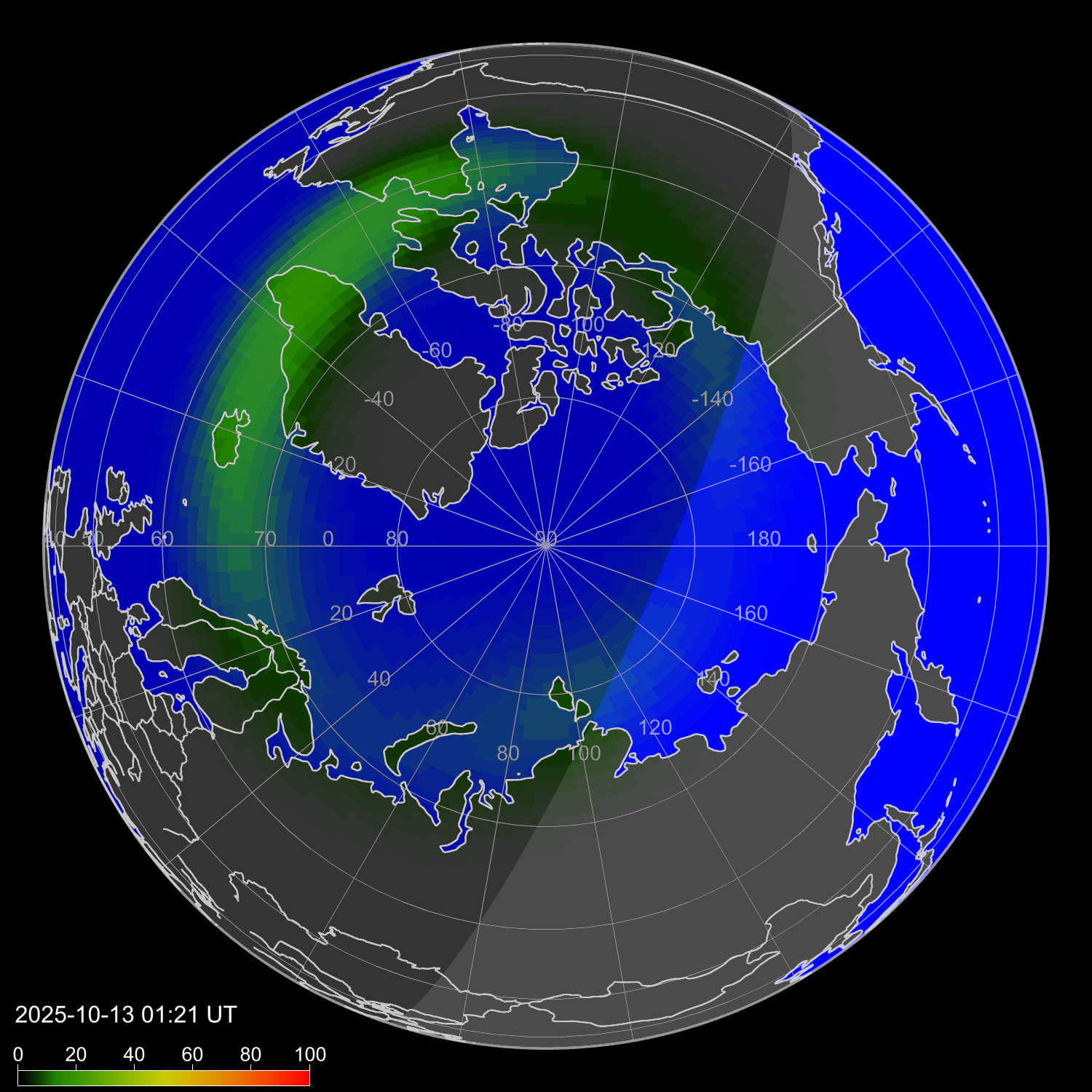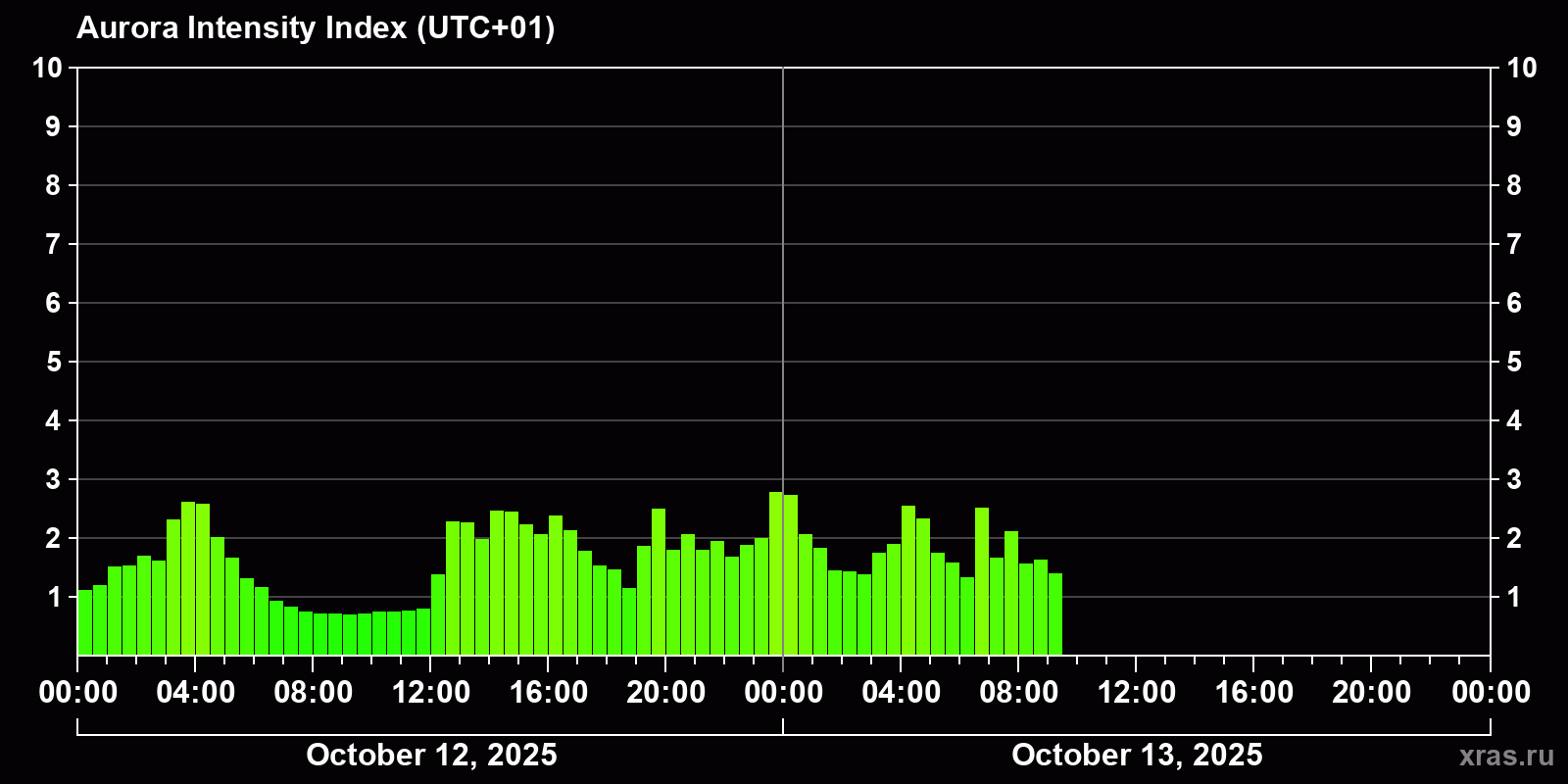 Изменения и часовой прогноз индекса интенсивности полярных сияний с 2025-10-09 по 2025-10-10