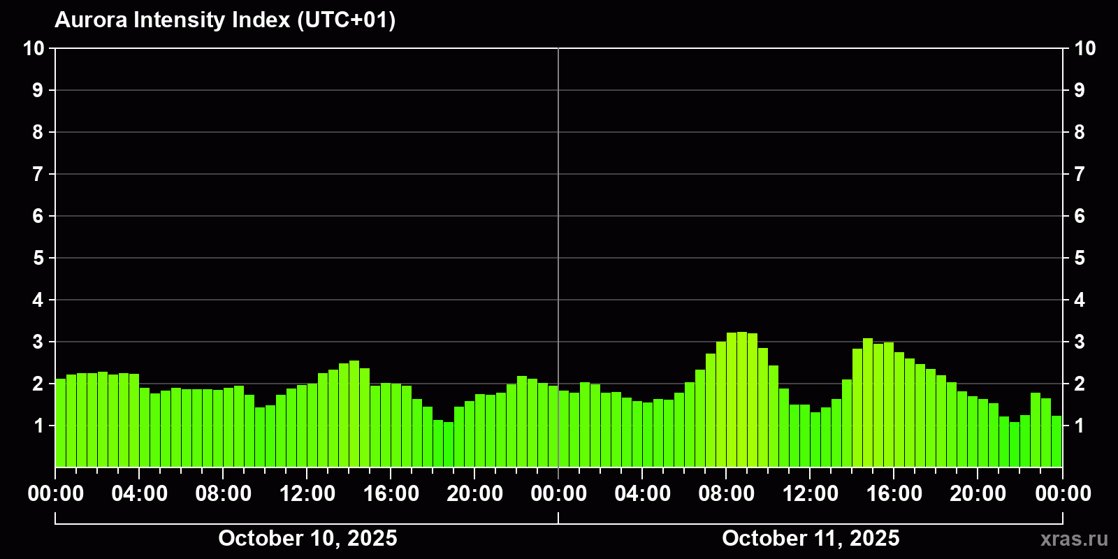 Changes in the auroral intensity index from 2025-10-10 to 2025-10-11 local time