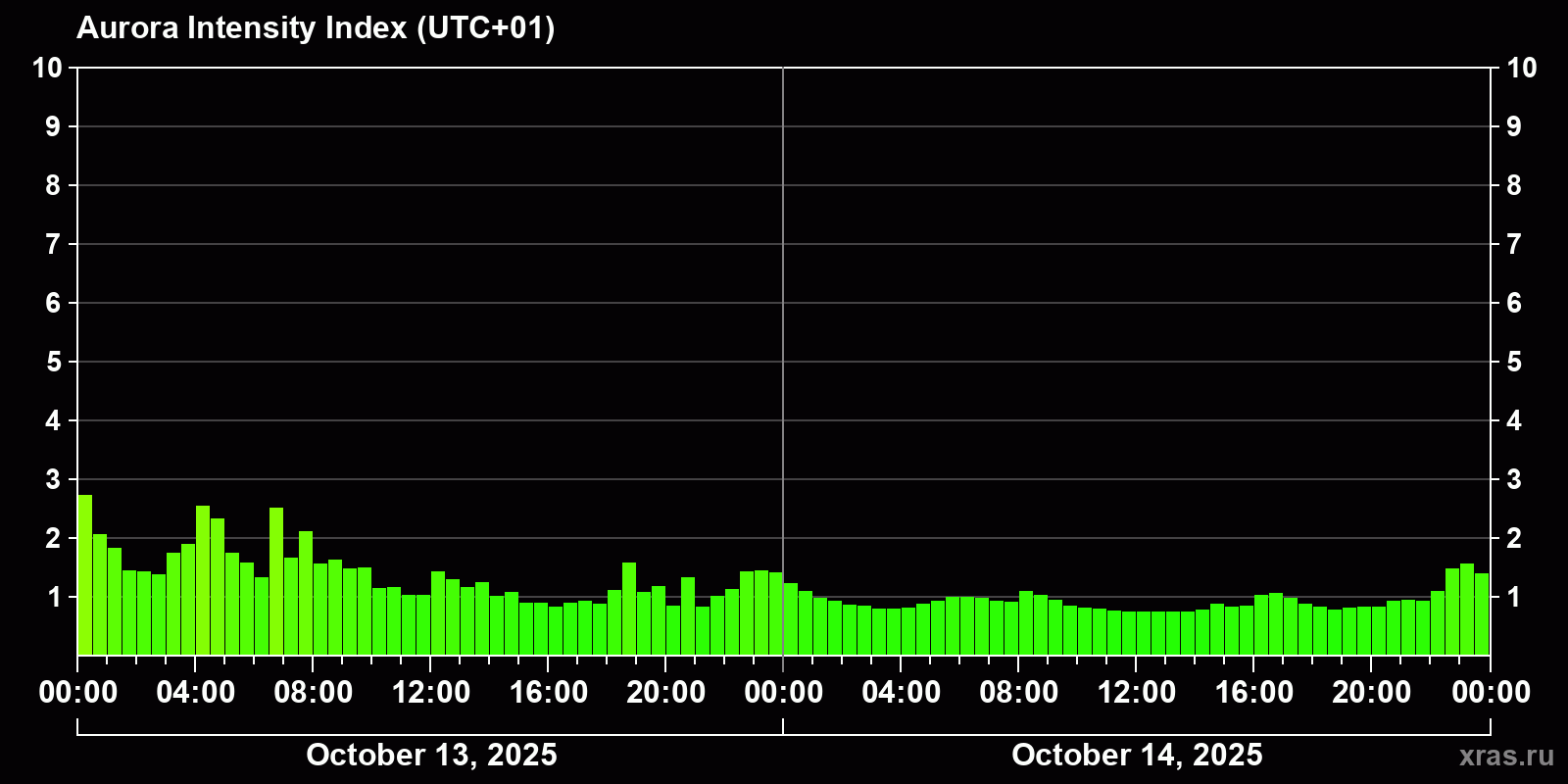Changes in the auroral intensity index from 2025-10-13 to 2025-10-14 local time