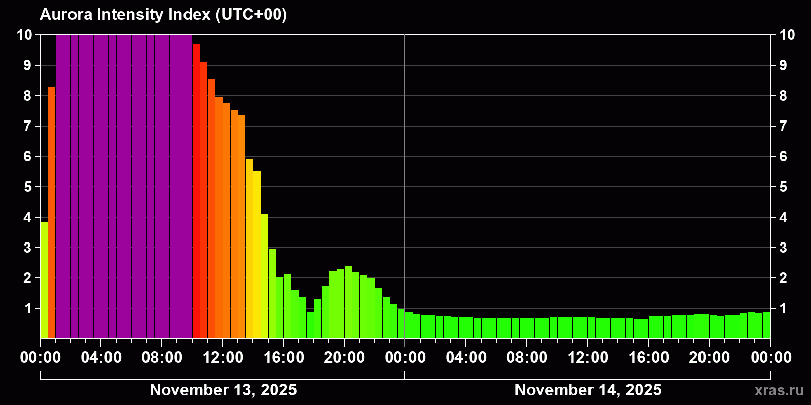 Changes in the auroral intensity index from 2025-11-13 to 2025-11-14 local time