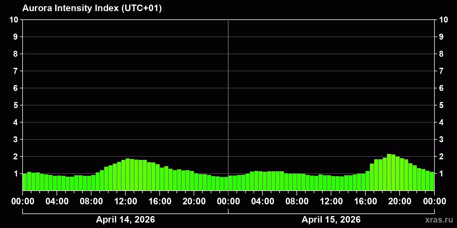 Changes in the auroral intensity index from 2026-04-14 to 2026-04-15 local time