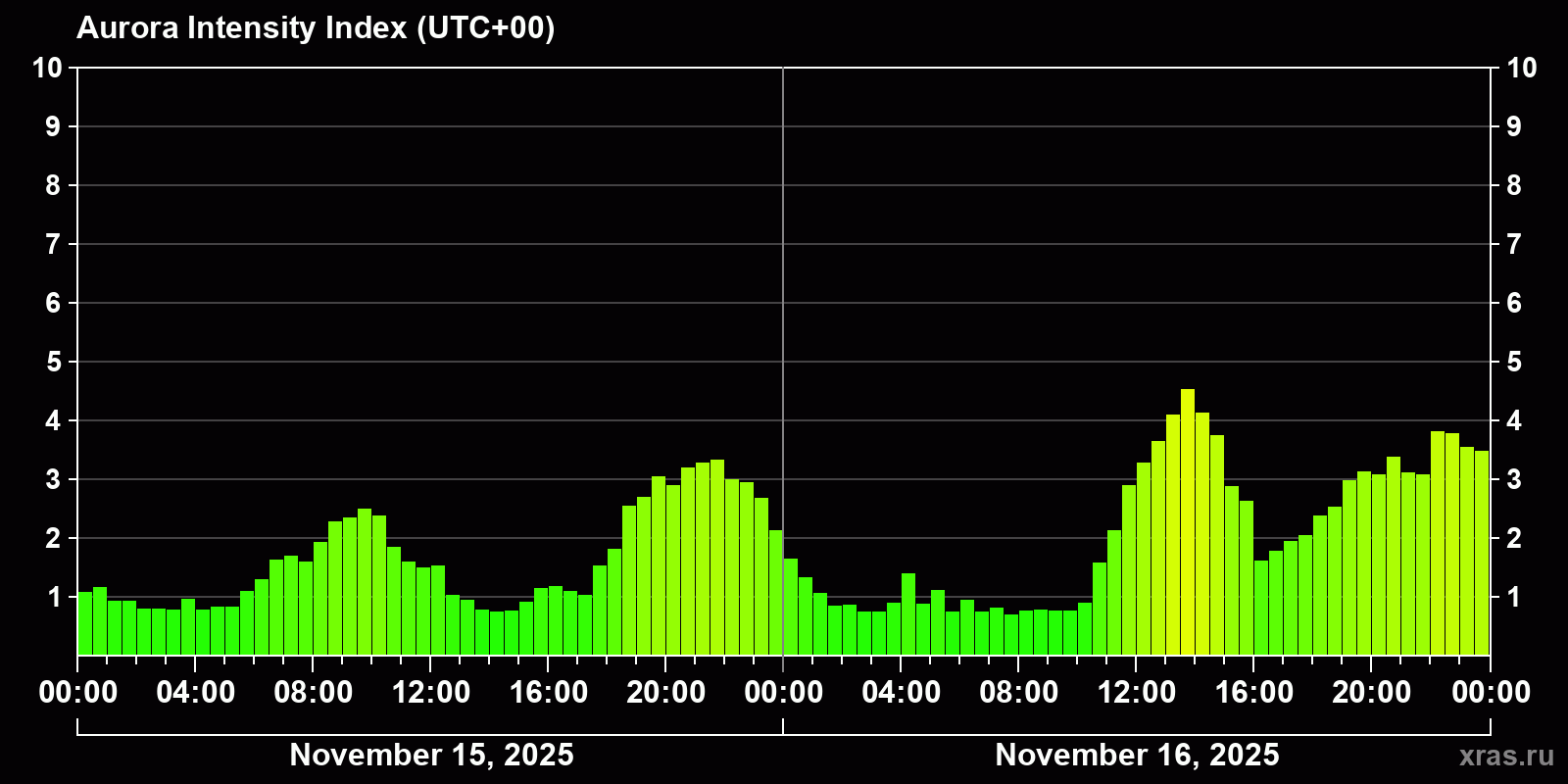 Changes in the auroral intensity index from 2025-11-15 to 2025-11-16 local time