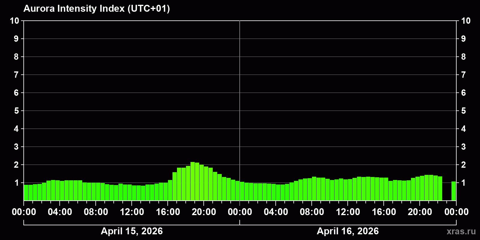 Changes in the auroral intensity index from 2026-04-15 to 2026-04-16 local time