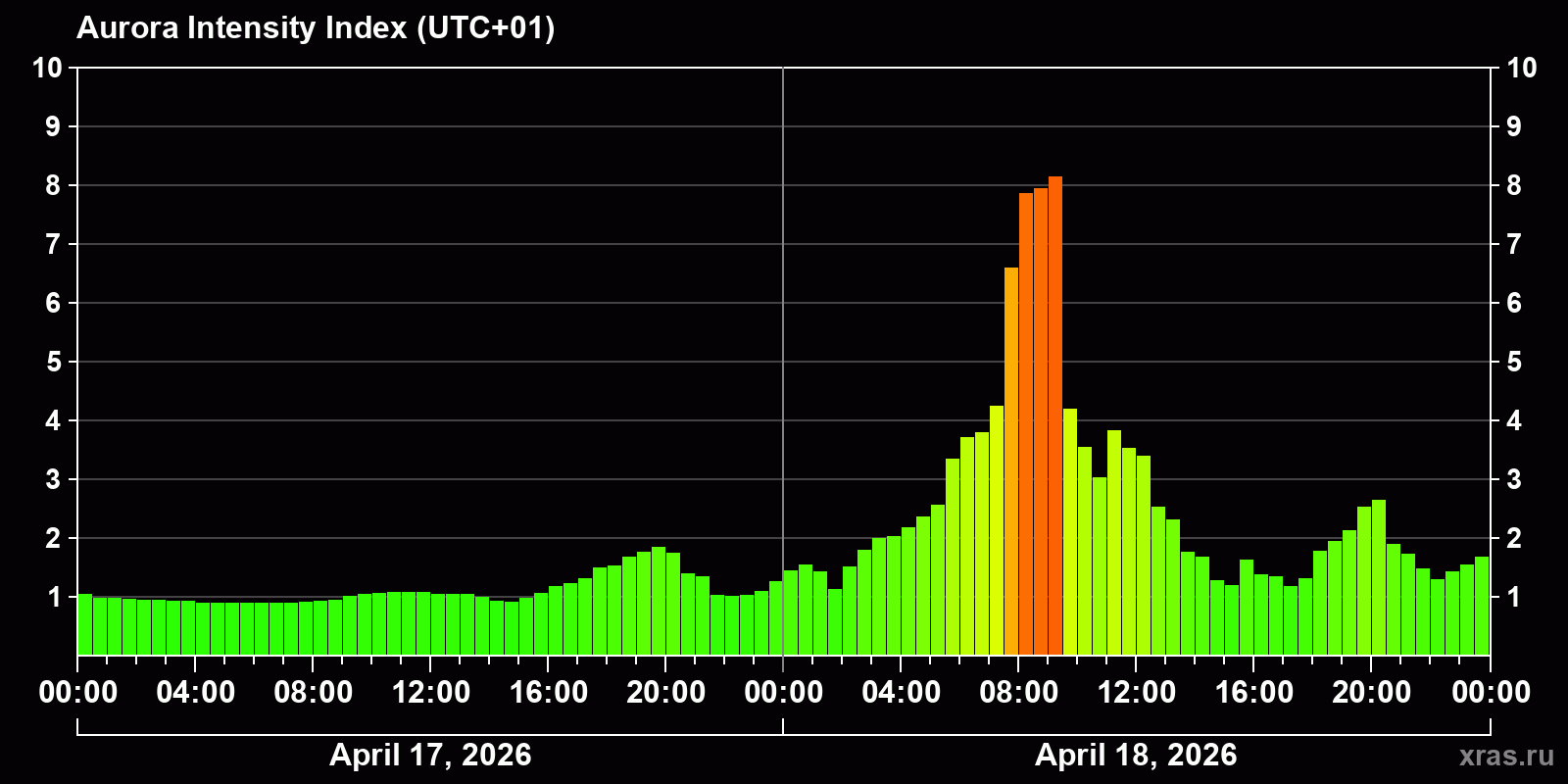 Changes in the auroral intensity index from 2026-04-17 to 2026-04-18 local time