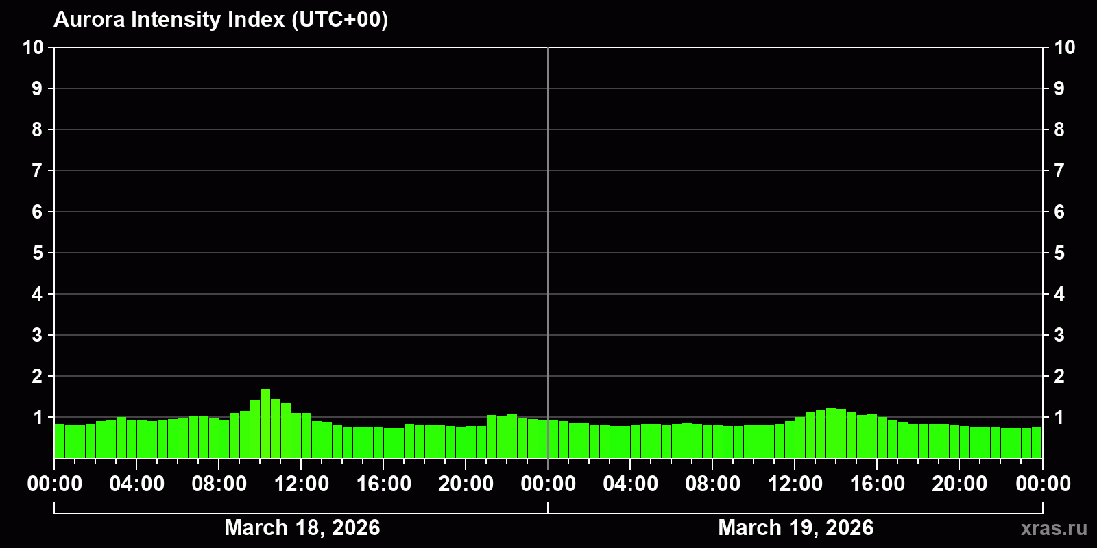 Changes in the auroral intensity index from 2026-03-18 to 2026-03-19 local time