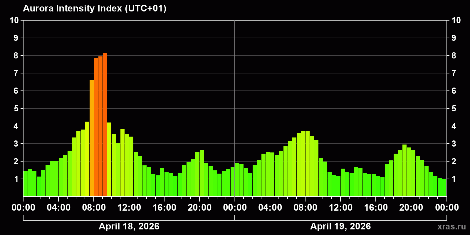 Auroral intensity index and the theoretically possible latitude of observations for nighttime in the Estern Hemisphere as of 2026-04-19 23:54 (end of day) local time