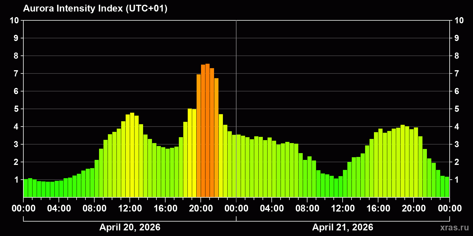 Changes in the auroral intensity index from 2026-04-20 to 2026-04-21 local time