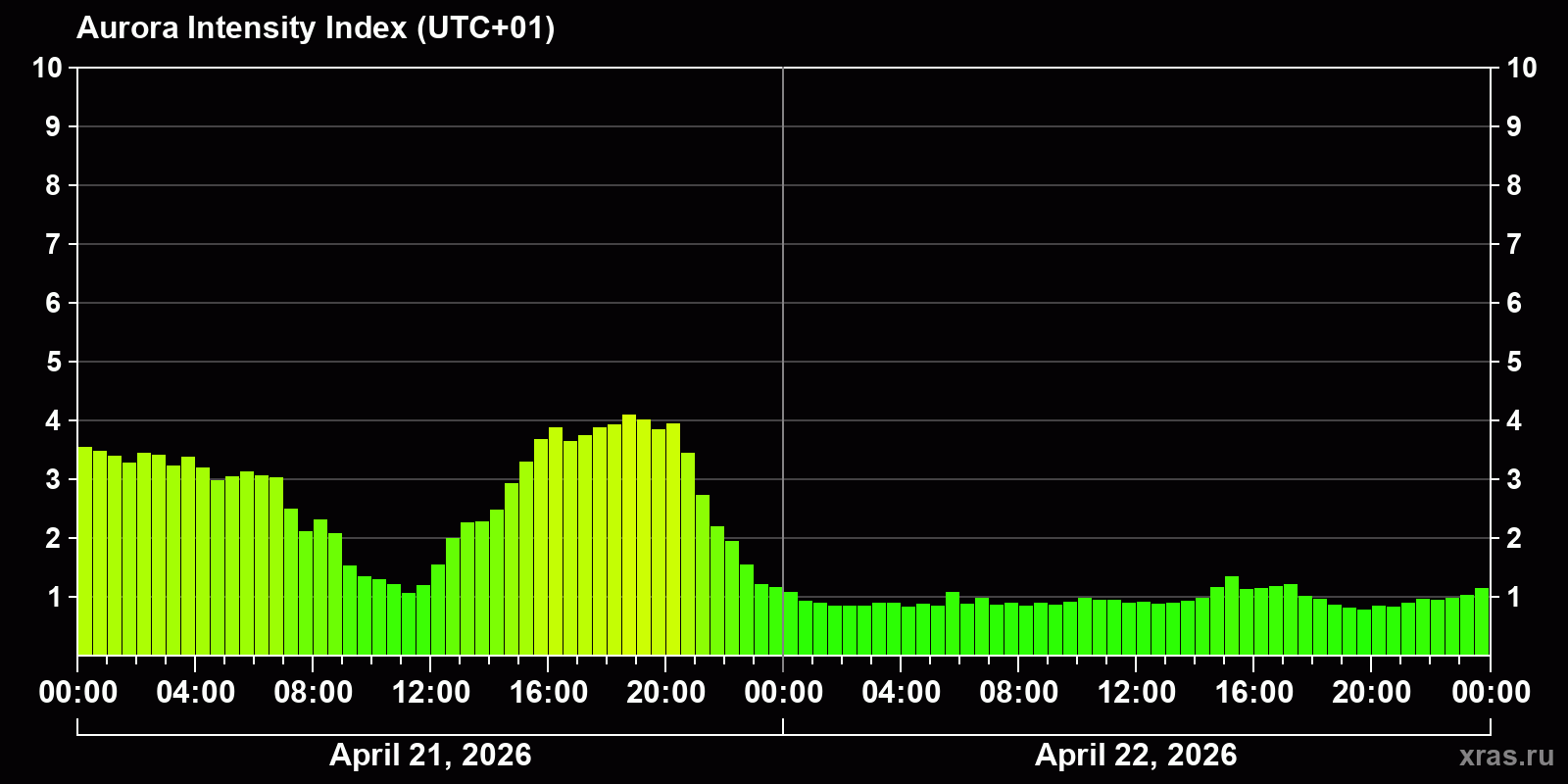 Changes in the auroral intensity index from 2026-04-21 to 2026-04-22 local time