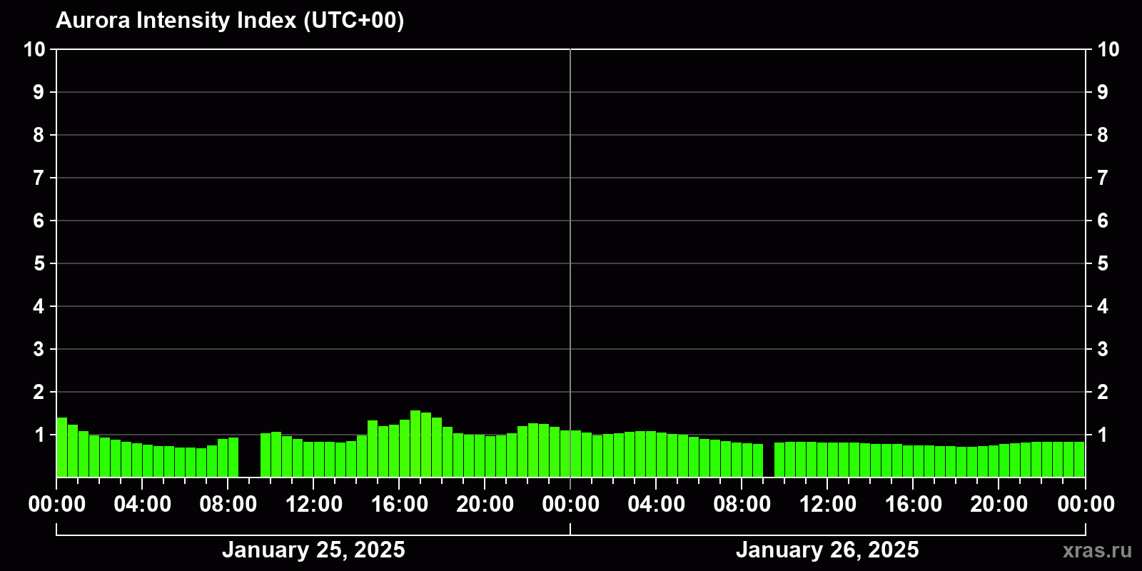 Changes in the auroral intensity index from 2025-01-25 to 2025-01-26 local time