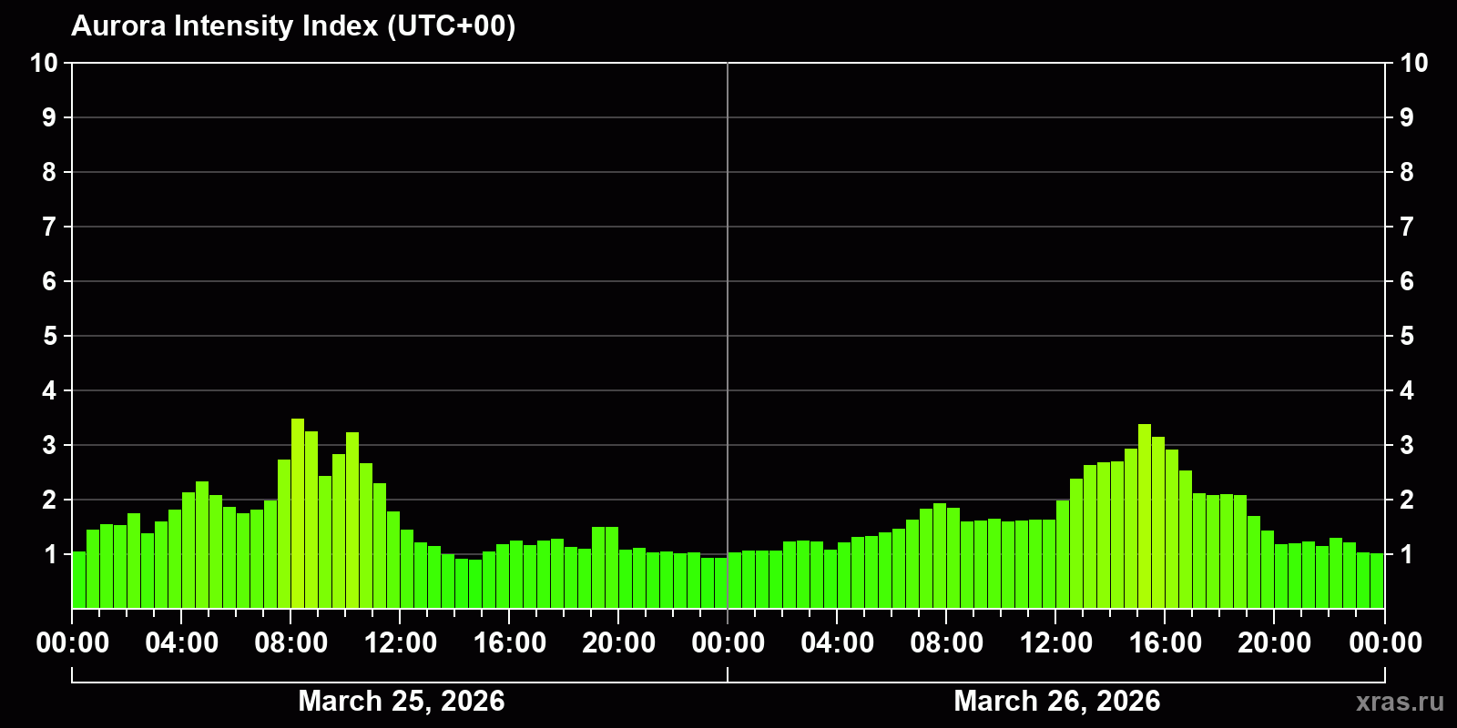 Changes in the auroral intensity index from 2026-03-25 to 2026-03-26 local time
