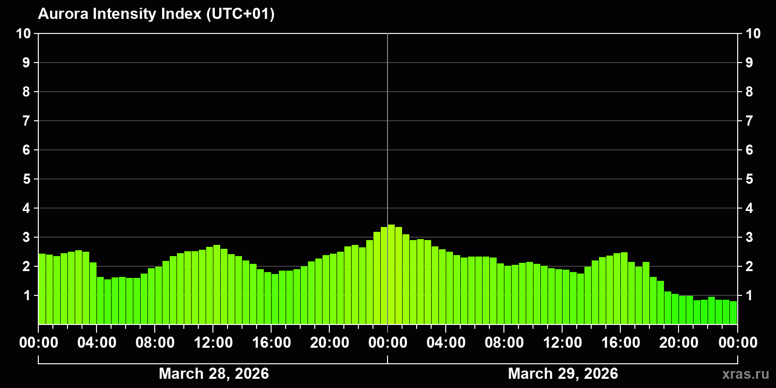 Auroral intensity index and the theoretically possible latitude of observations for nighttime in the Estern Hemisphere as of 2026-03-29 23:47 (end of day) local time