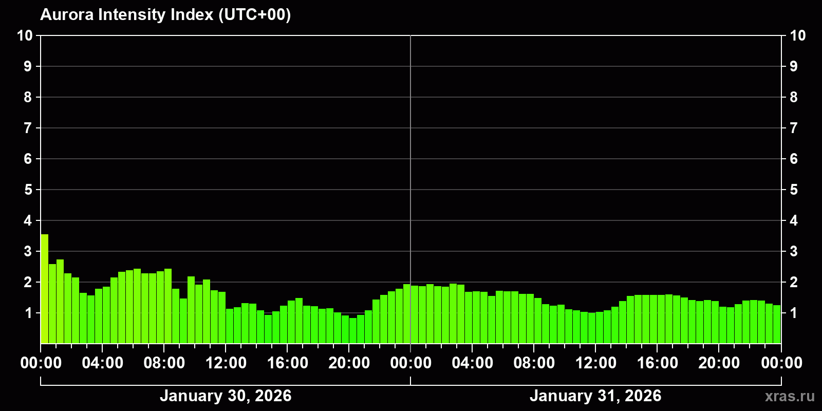 Auroral intensity index and the theoretically possible latitude of observations for nighttime in the Estern Hemisphere as of 2026-01-31 23:47 (end of day) local time