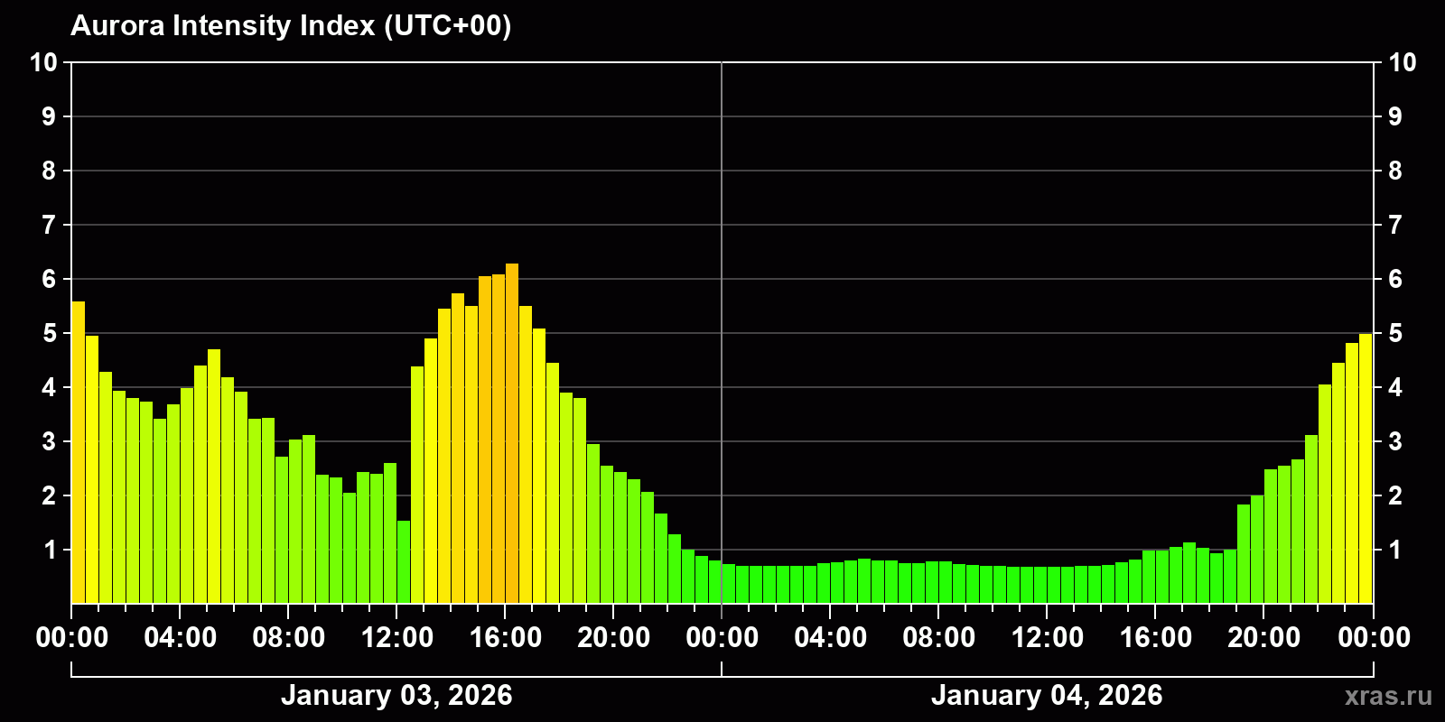 Auroral intensity index and the theoretically possible latitude of observations for nighttime in the Estern Hemisphere as of 2026-01-04 23:56 (end of day) local time