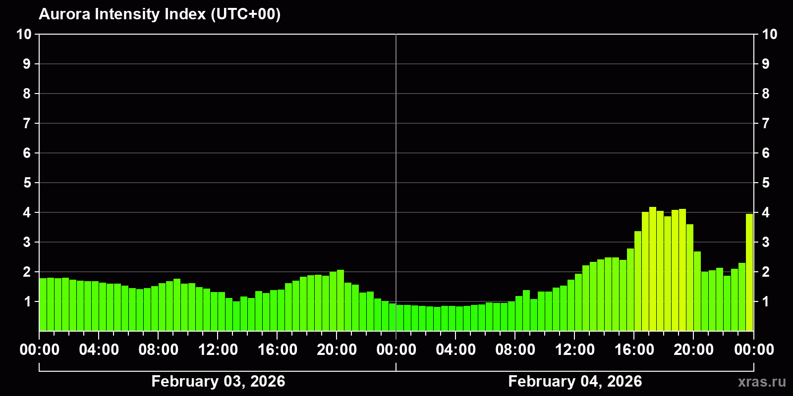 Auroral intensity index and the theoretically possible latitude of observations for nighttime in the Estern Hemisphere as of 2026-02-04 23:55 (end of day) local time