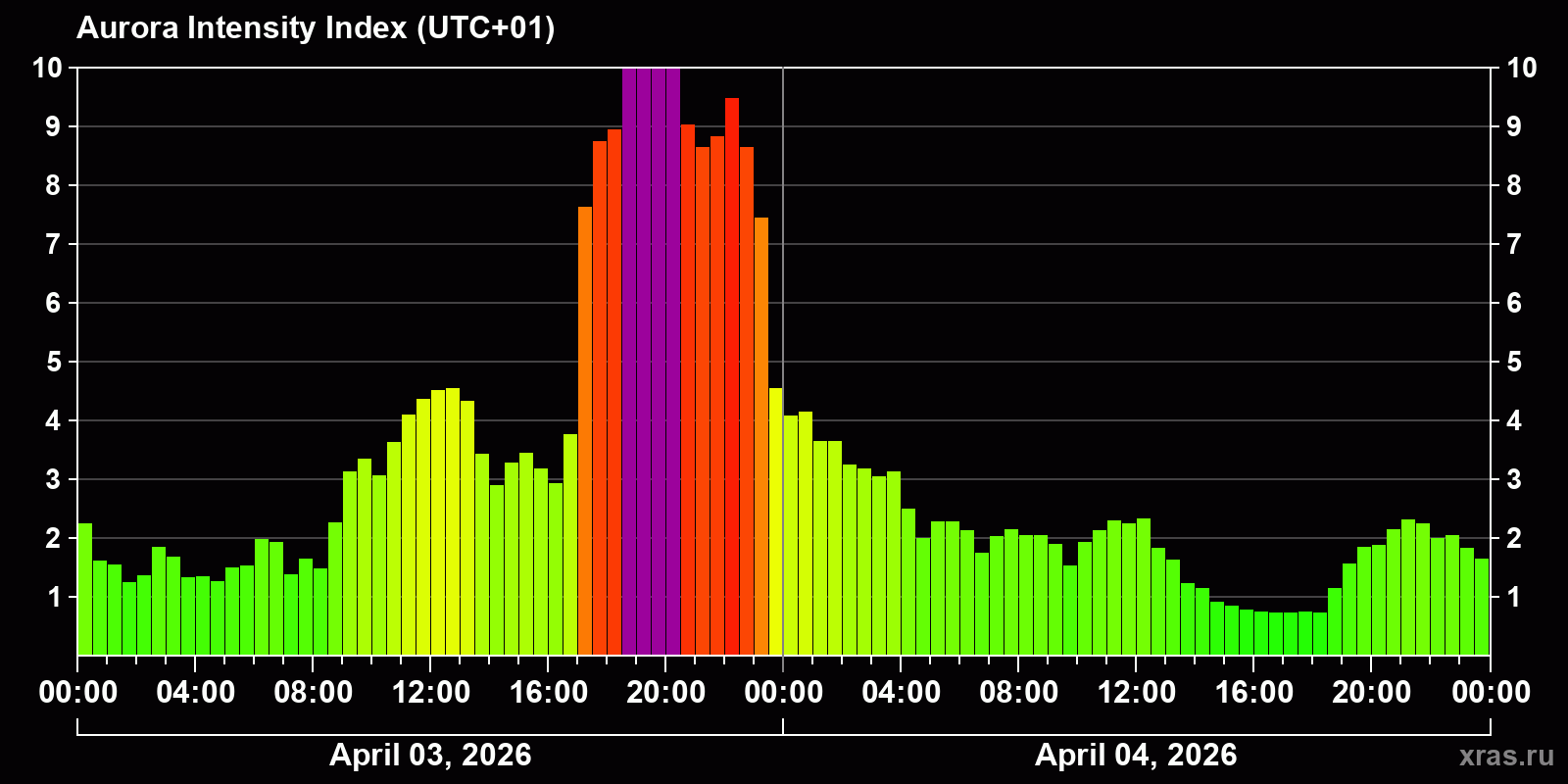 Changes in the auroral intensity index from 2026-04-03 to 2026-04-04 local time