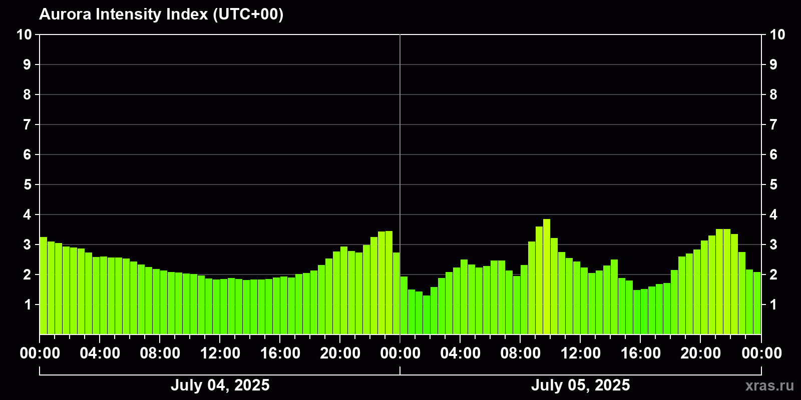 Auroral intensity index and the theoretically possible latitude of observations for nighttime in the Estern Hemisphere as of 2025-07-06 00:57 (end of day) local time