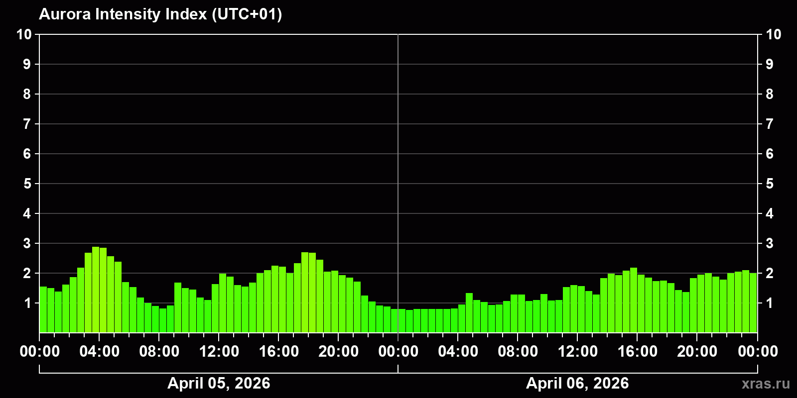 Changes in the auroral intensity index from 2026-04-05 to 2026-04-06 local time