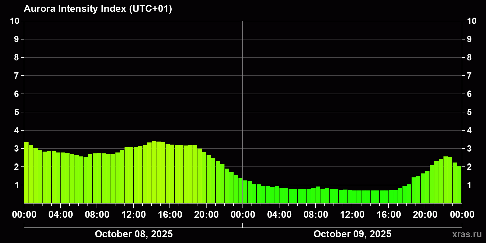 Auroral intensity index and the theoretically possible latitude of observations for nighttime in the Estern Hemisphere as of 2025-10-09 23:47 (end of day) local time