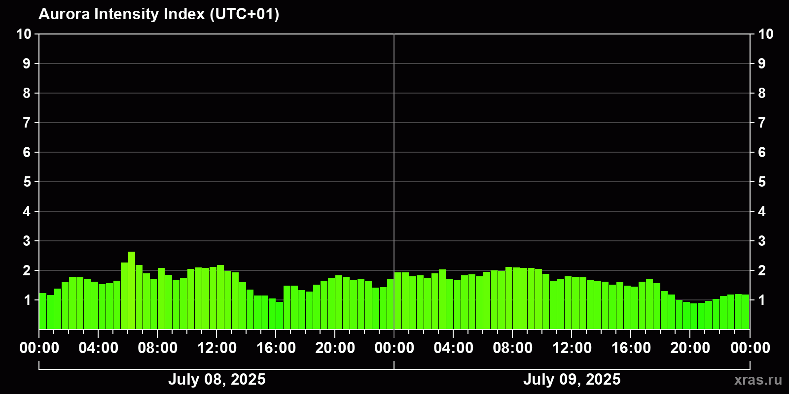 Changes in the auroral intensity index from 2025-07-08 to 2025-07-09 local time
