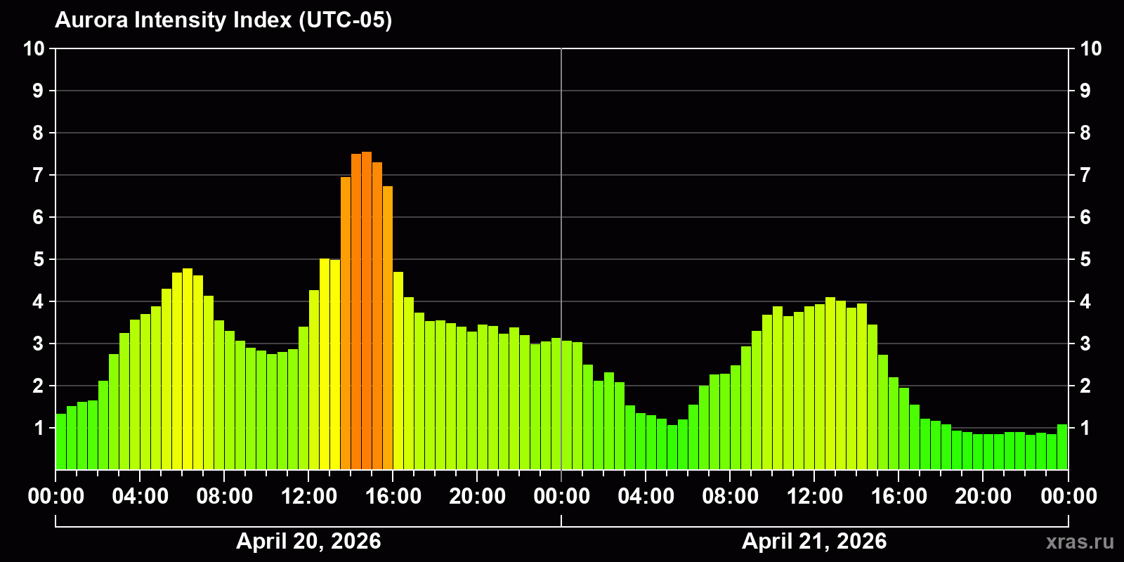 Changes in the auroral intensity index from 2026-04-20 to 2026-04-21 local time