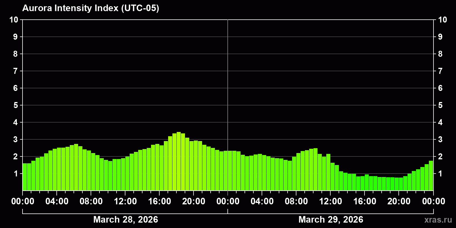 Changes in the auroral intensity index from 2026-03-28 to 2026-03-29 local time