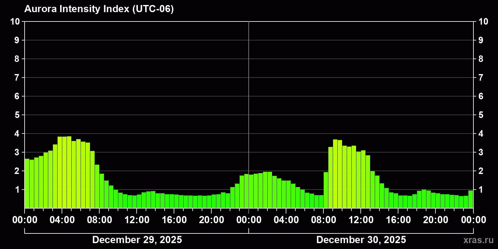 Auroral intensity index and the theoretically possible latitude of observations for nighttime in the Western Hemisphere as of 2025-12-30 23:50 (end of day) local time