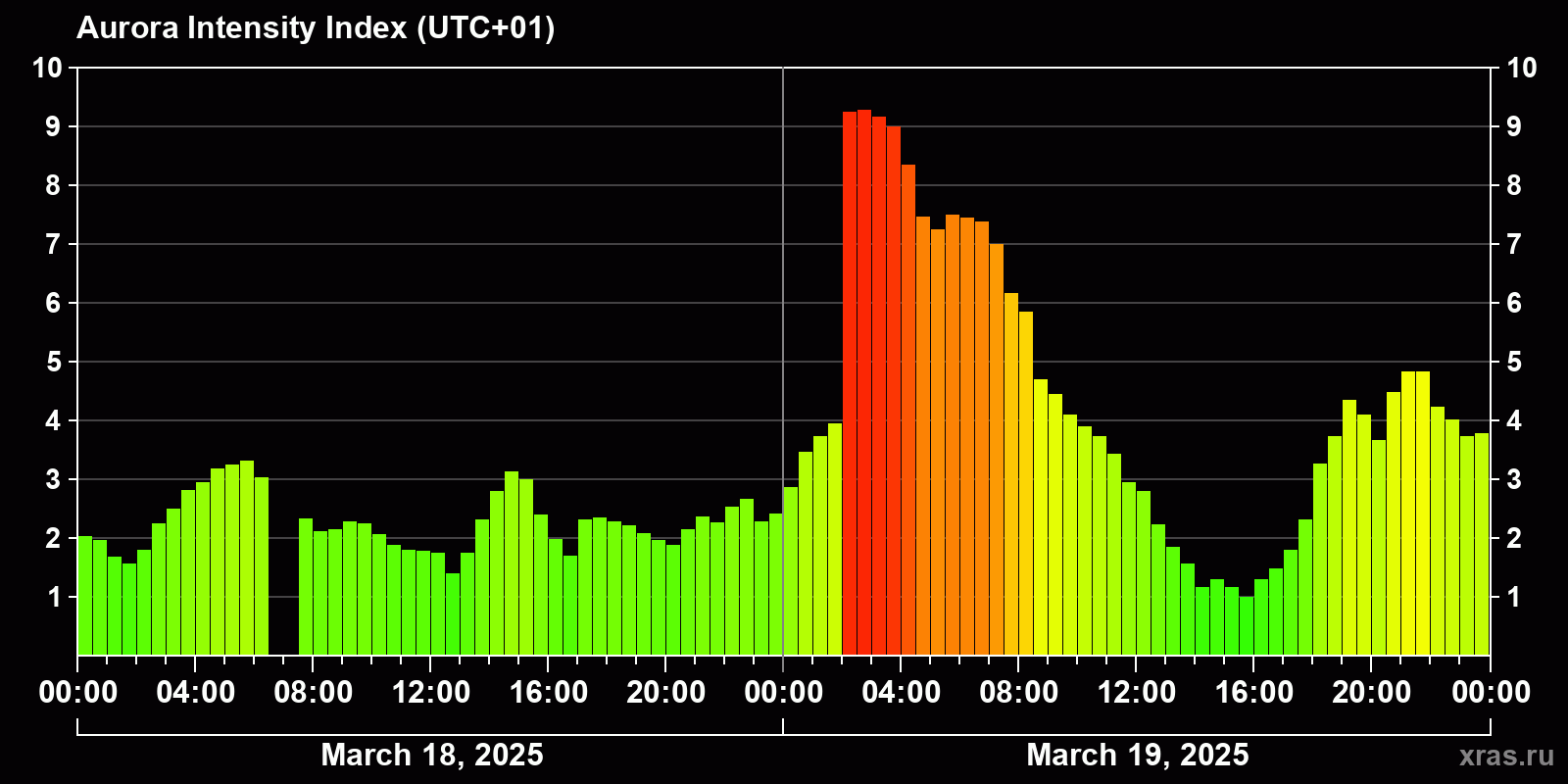 Changes in the auroral intensity index from 2025-03-18 to 2025-03-19 local time