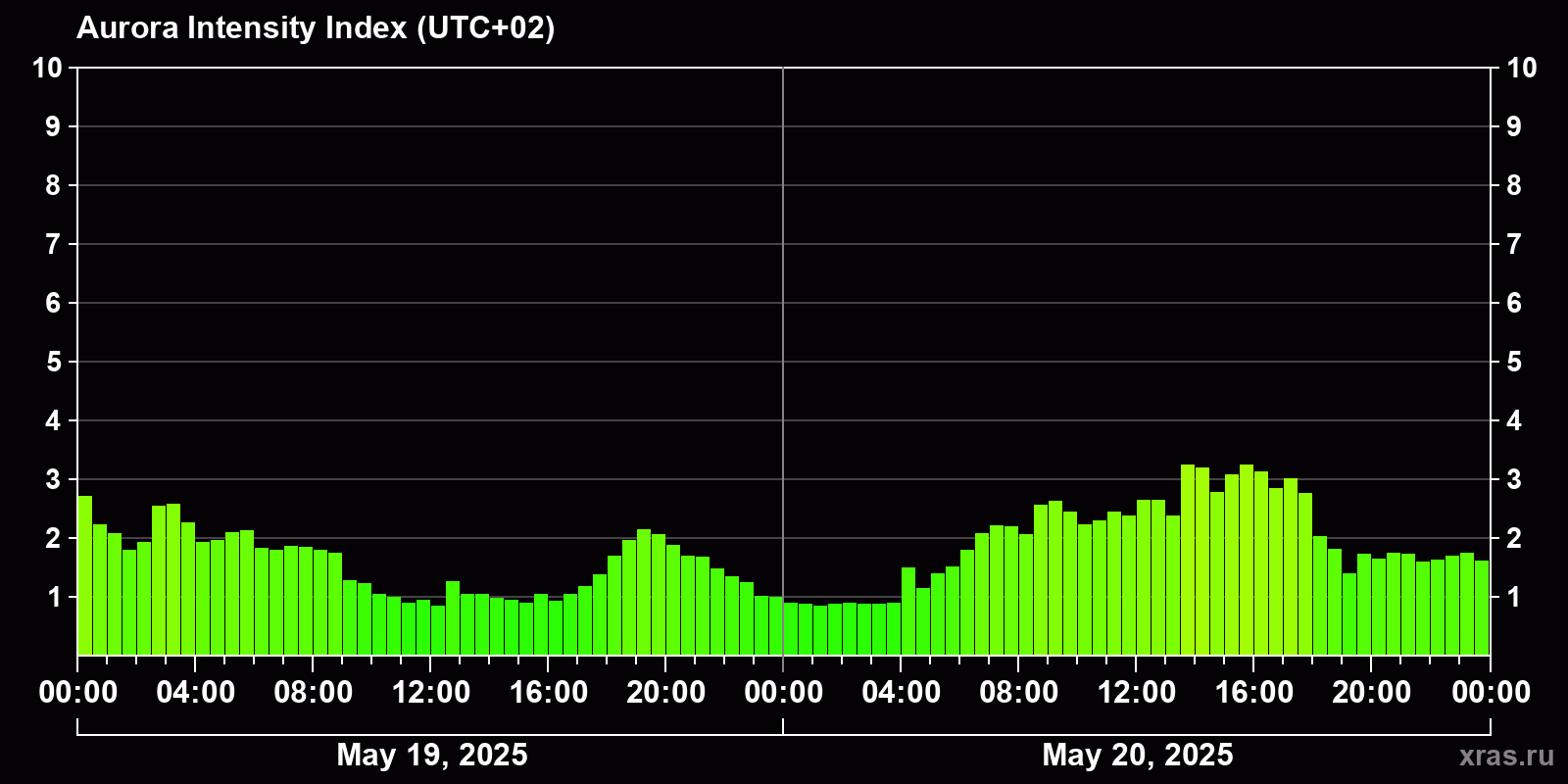 Changes in the auroral intensity index from 2025-05-19 to 2025-05-20 local time