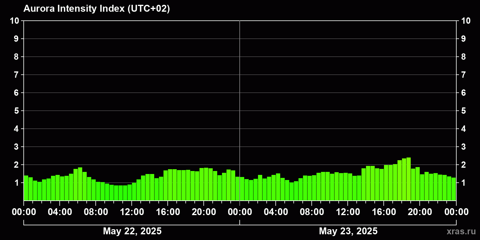 Changes in the auroral intensity index from 2025-05-22 to 2025-05-23 local time